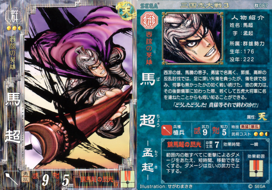 名:奸雄 字:ツミ 調布のゲーセンをホームグランドに暴れております。 チーム「乱華」のリーダーをやっております。 君主名は奸雄です。 呂布ワラメイン、蜀or魏をサブデッキで使っております。 見かけましたら気軽に話しかけてください。 蒼天航路の話しをされると喜びます。
